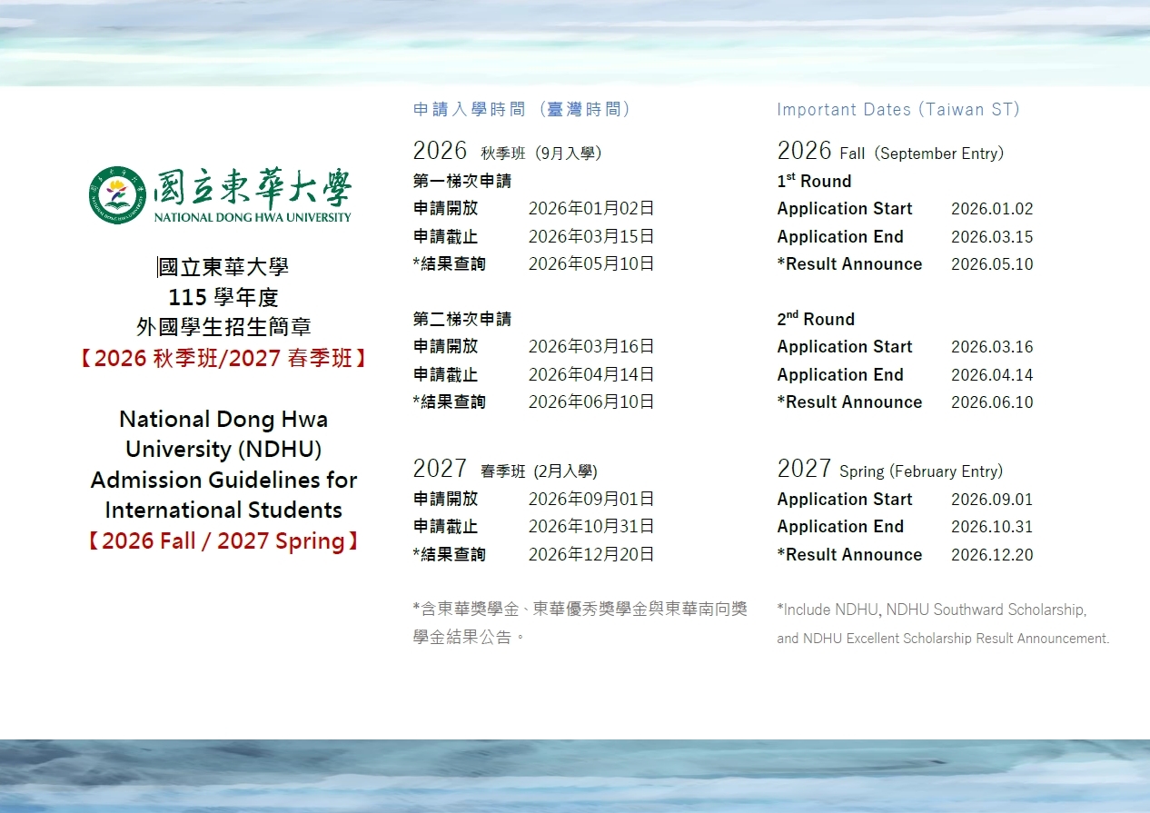 Note: If you are interested in applying for admission to transfer to NDHU, please refer to our Admission Guidelines for Transfer Programs(國立東華大學外國學生轉學招生簡章) for detailed information.